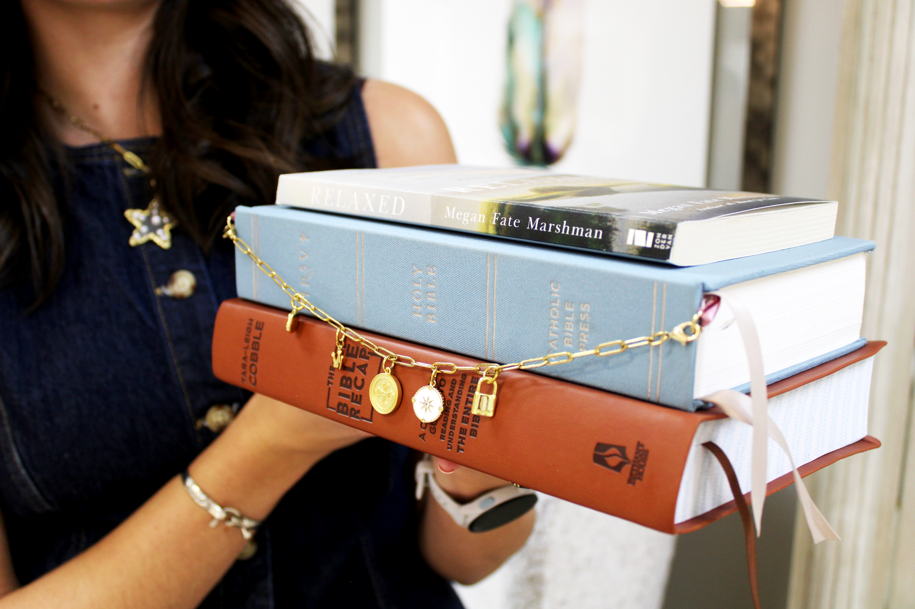 First, add your charms, then rearrange how you want it. Last, Add your color ribbon as a book mark!