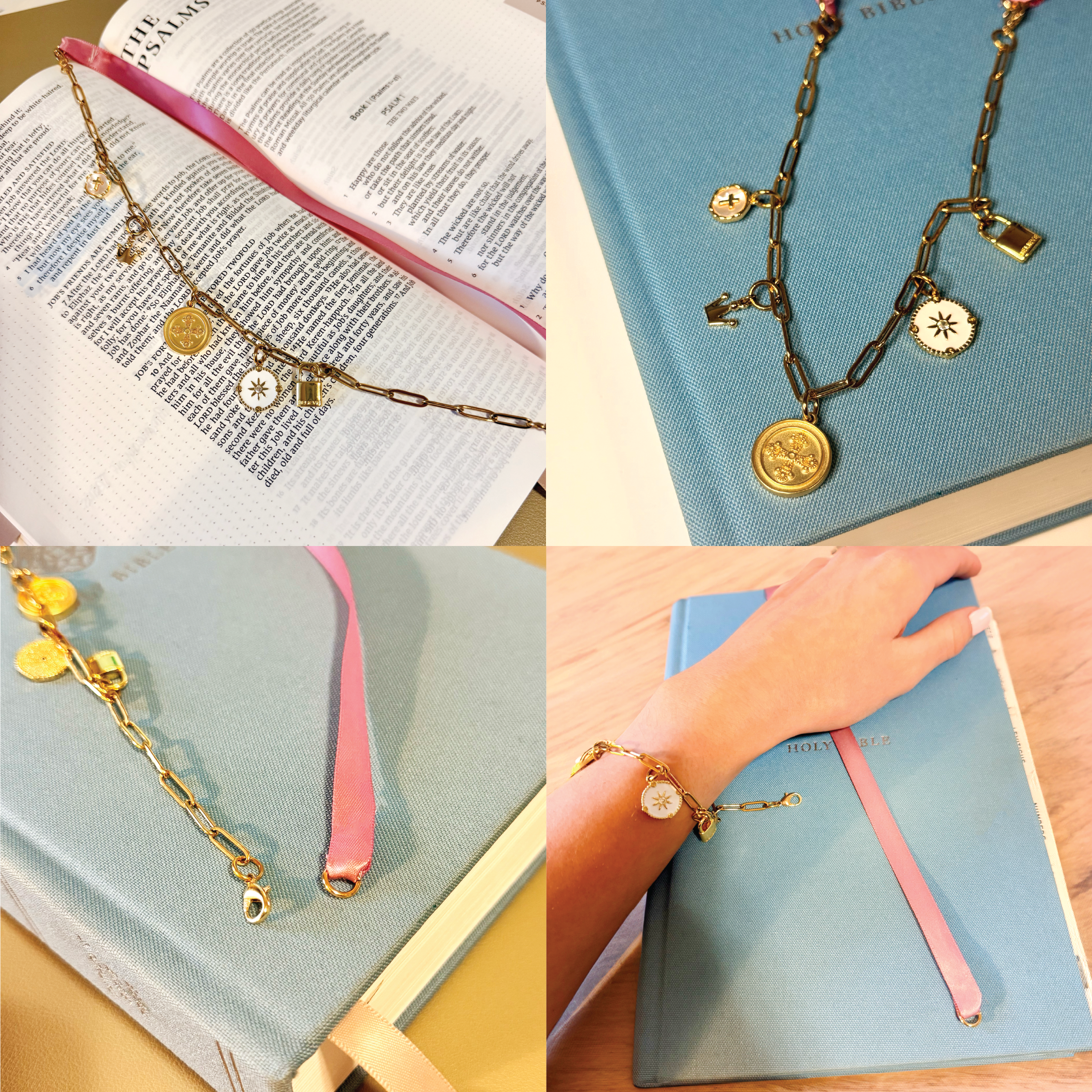 Our book chains are made with a ribbon & chain! This lets your book pages stay nice and pretty! Each chain is also detachable, and can be created into a bracelet!